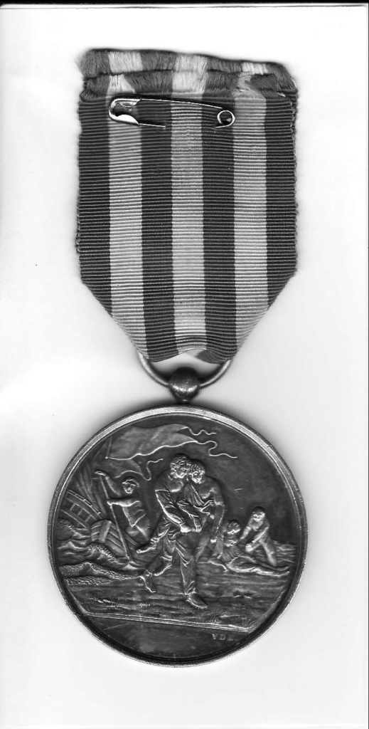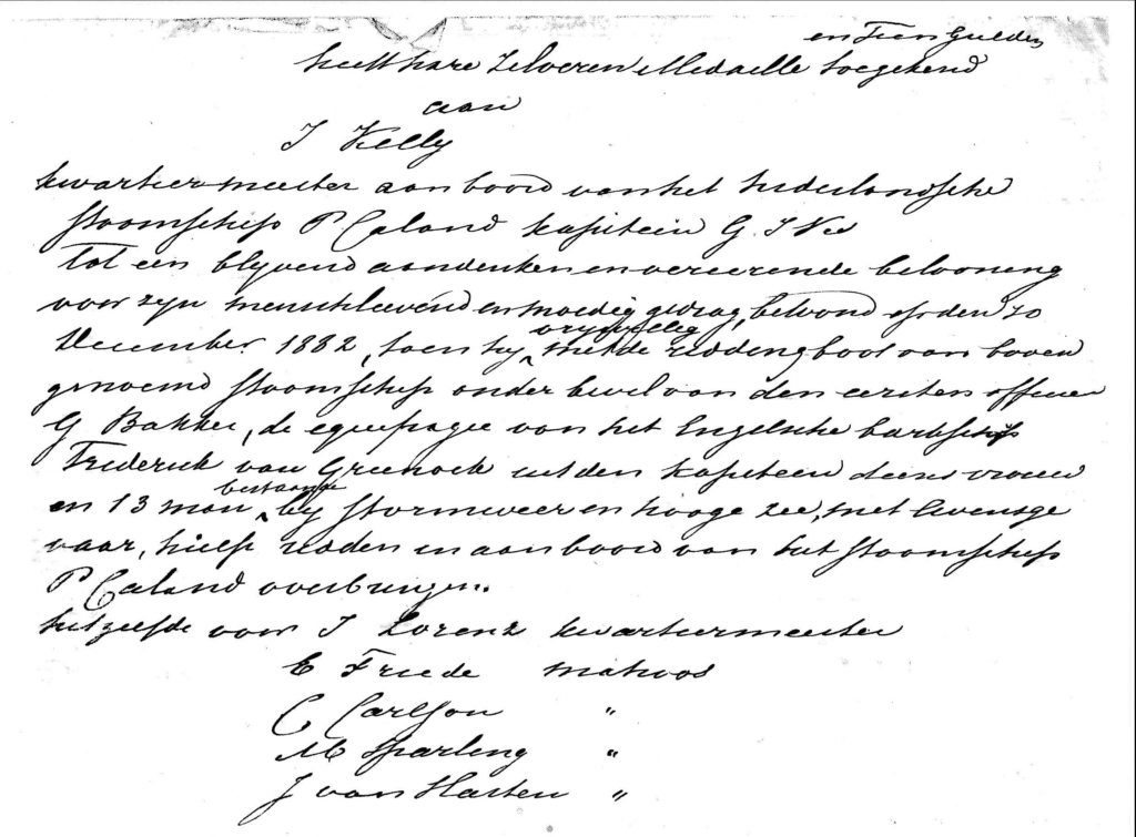 kwartiermeester aan boord van het Nederlandsche stoomschip P. Caland kapitein G.J.Vis tot een blijvend aandenken en vereerende belooning voor zijn menschlievend en moedig gedrag, betoond op den 10 December 1882, toen hij vrijwillig met de reddingboot van bovengenoemd stoomschip onder bevel van den eerste officier G. Bakker, de equipagie van het Engelsche barkschip Frederick van Greenock met den kapitein diens vrouw en 13 man, bestaande bij stormweer en hooge zee, met levensgevaar, hielp redden en aan boord van het stoomschip P. Caland overbrengen.