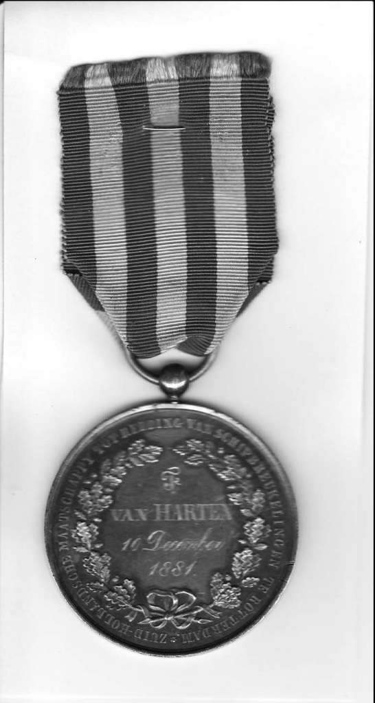 Genoemde jaartal 1882 in bovenstaande tekst moet zijn 1881, gezien de datering van de ondertekening van de tekst voor de oorkonde en de datum op de medaille. De medaille geeft F. i.p.v. de genoemde J van Harten.